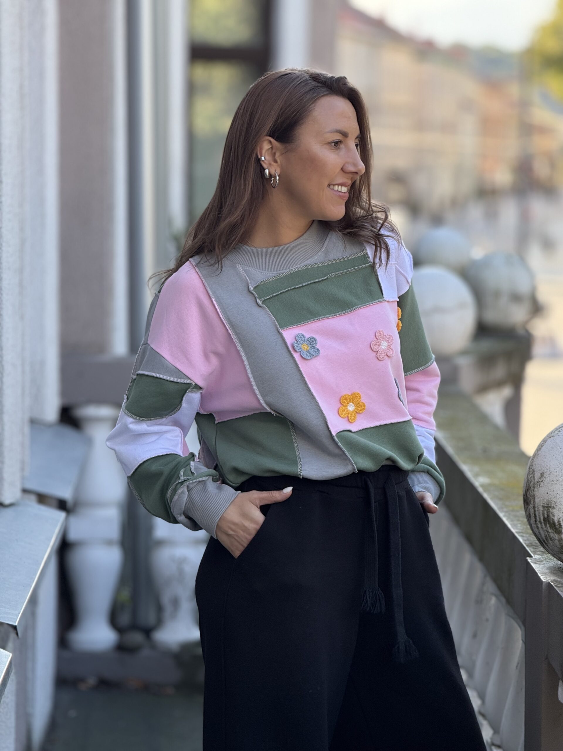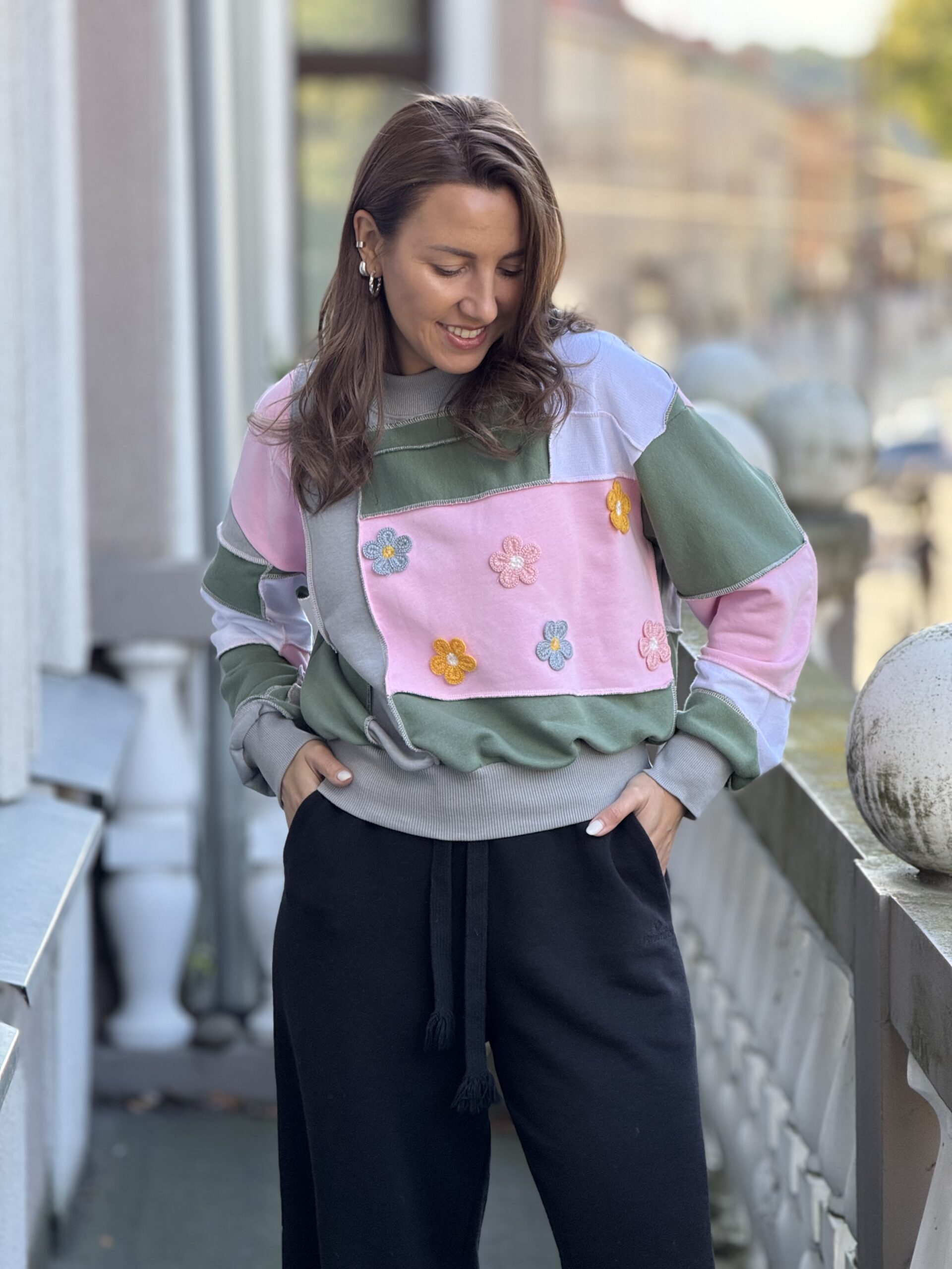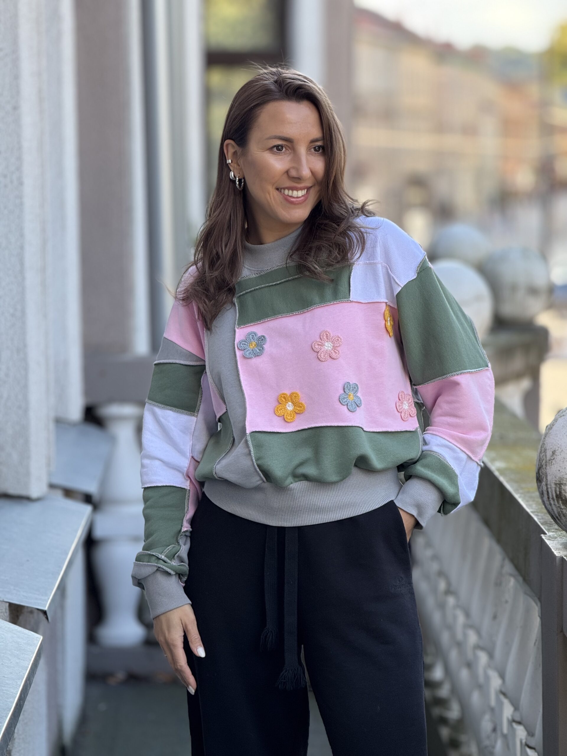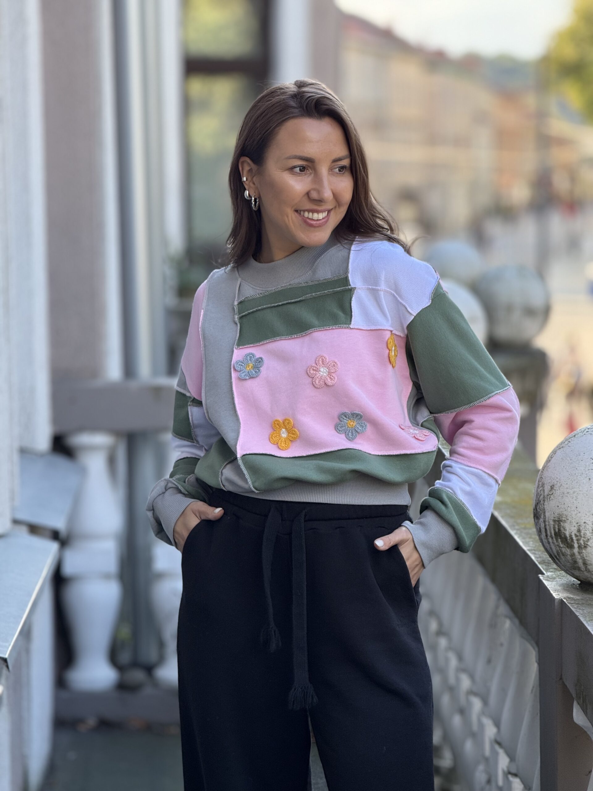 Rožinis/pilkas #zerowaste bliuzonas su gėlytėmis (S-M dydis)