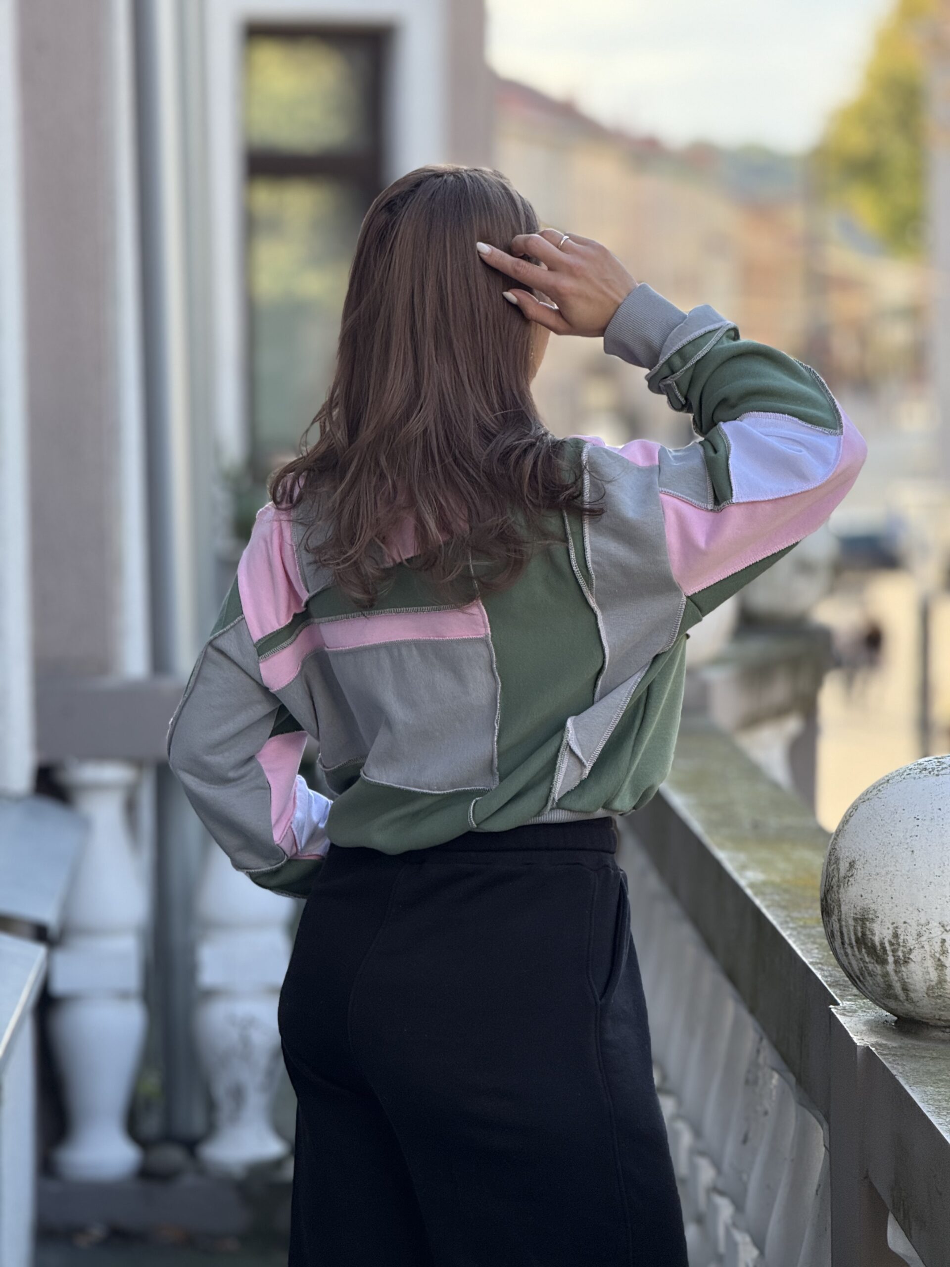Smulkiomis detalėmis jungtas bliuzonas. Unikalus ir vienetinis drabužis. Pagrindas-kilpinis trikotažas.