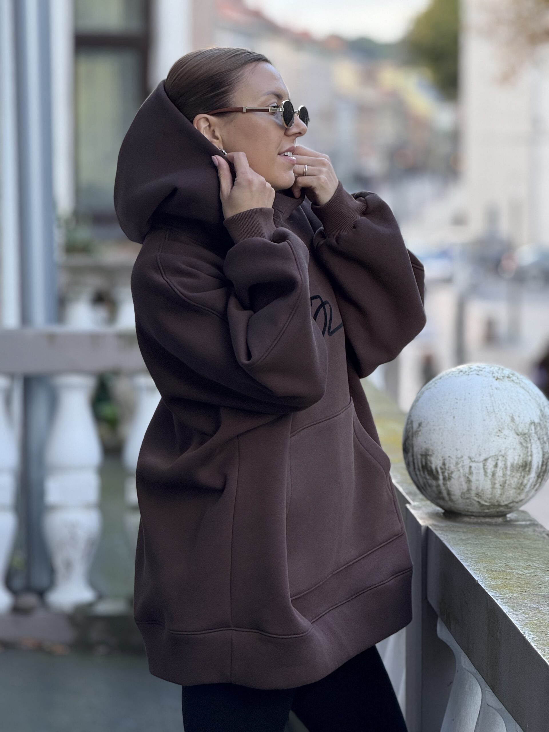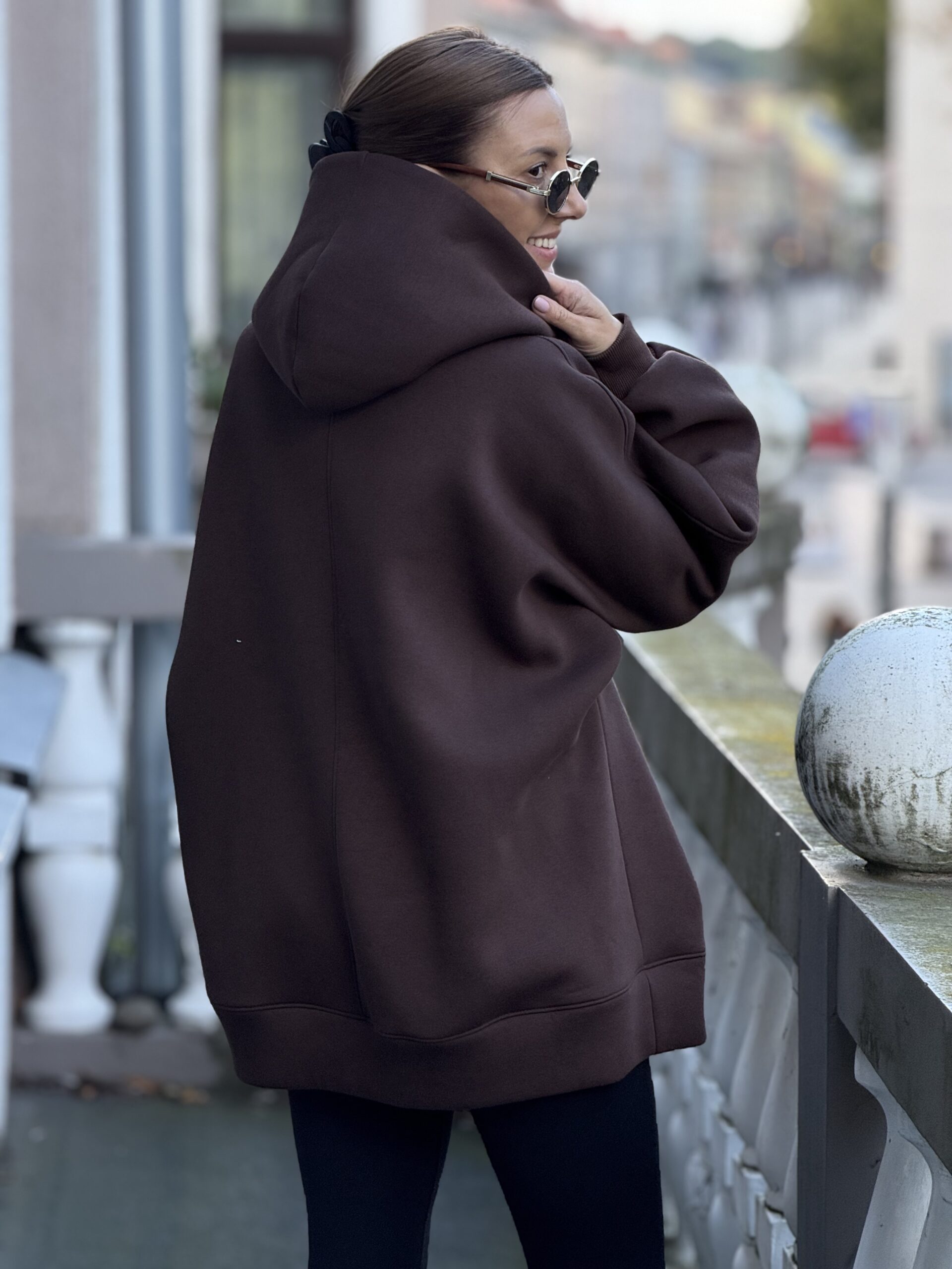 Šokoladinis OVERSIZE didelis bliuzonas su gobtuvu (su pūkeliu)