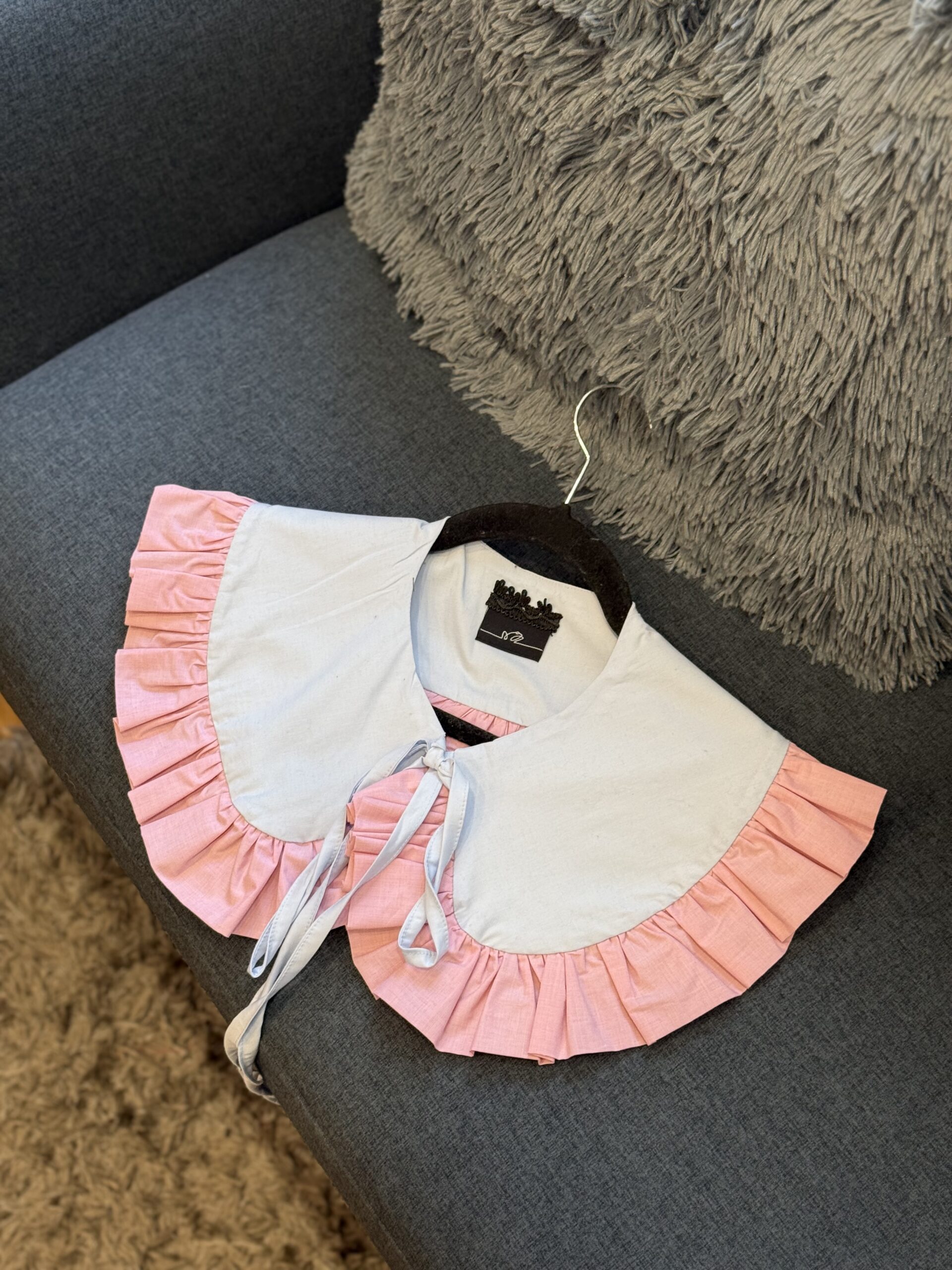 švelniai žydra su rožine medvilnės apykaklė
