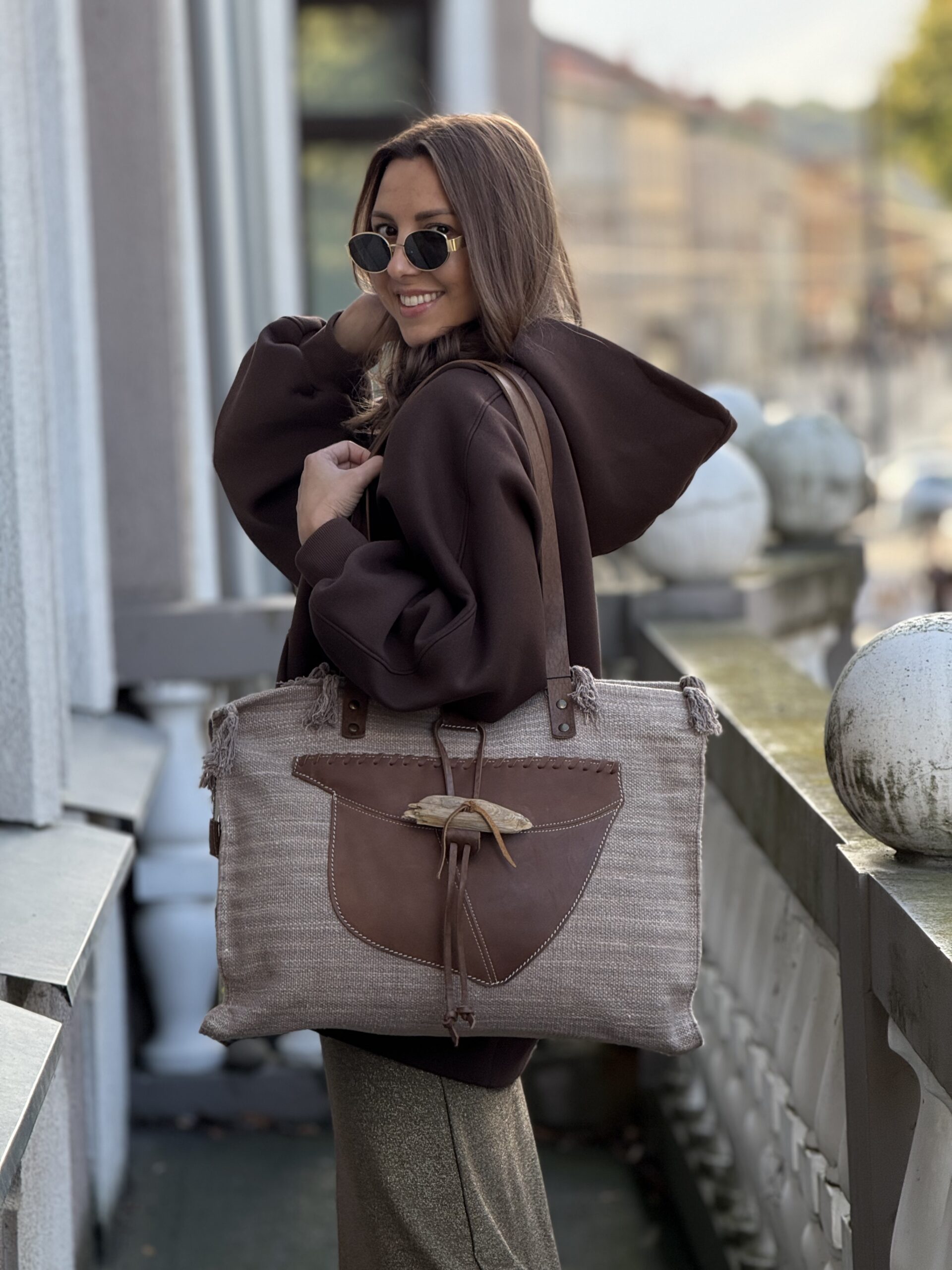 Audinys iš lino ir medvilnės, labai tvirtas ir atrodo estetiškai tvarkingai ir labai meniškai. Jungta su natūralios odos detalėmis. Yra užtrauktukas, viduje šone kišenėlė ir ant priekio pridėtinė kišenė.